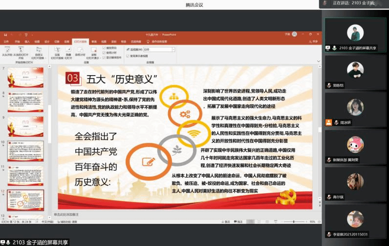 金子涵同学简要介绍了十九届六中全会的召开情况和重要意义,并带领大家回顾了全会的主要内容。全会指出,总结党的百年奋斗的重大成就和历史经验是出于“三个需要”的考虑。全会提出了“两个确立”的决定性意义,指出了中国共产党百年奋斗的五大“历史意义”,概括了“十个坚持”的历史经验。全会强调,全党要牢记一个“根本问题”、坚持四个“必须”,并提出一个“号召”。