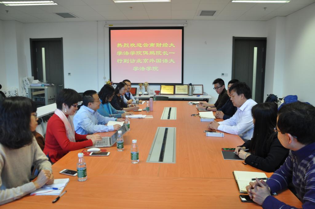 2018年11月27日上午,云南财经大学yl7703永利官网院长佴鹏一行7人到访永利官网。永利官网米良书记、闫冬副院长、办公室主任刘辛及相关教师同佴院长一行进行了交流。米良书记和佴鹏院长分别介绍了各自学院的情况、优势及发展思路,表示希望在一带一路人才培养、东南亚法律人才培养、合作开展相关研究、本科教学、学科点建设等方面进行合作交流。闫冬副院长向客人们介绍了永利官网本科教学发展情况。老师们对各自的研究领域进行了讨论。