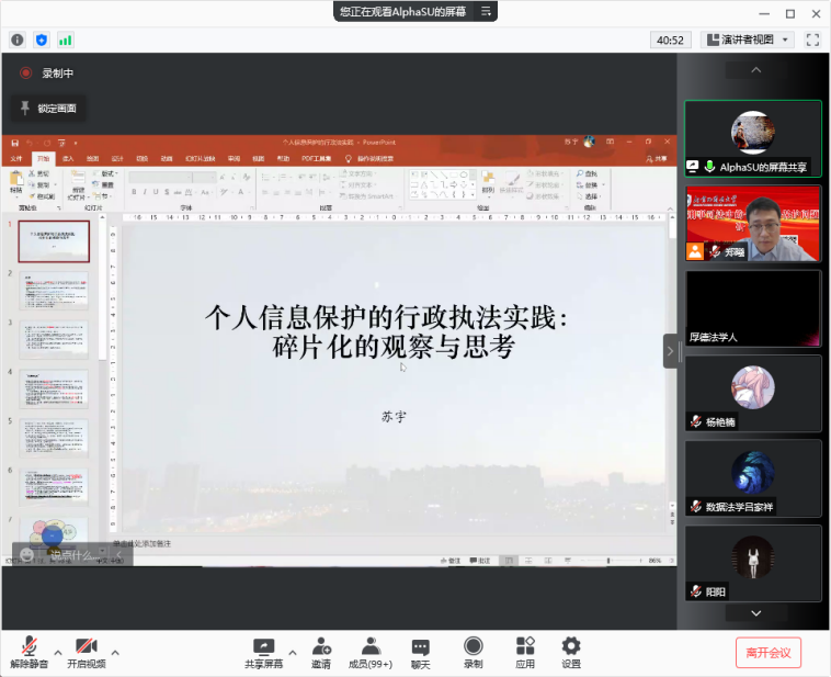 中国人民公安大学数据法学研究院院长苏宇副教授围绕“个人信息保护的行政执法实践:碎片化的观察与思考”发表了主旨演讲,以“统筹协调”一词的实践内涵为切入点梳理了个人信息保护中国家行政主管机关的职权来源与划分。