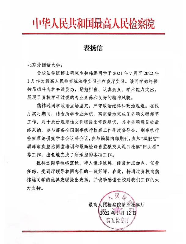 近日,最高人民检察院举行法律实习生总结座谈会,我校yl7703永利官网博士研究生魏祎远同学获评“优秀实习生”荣誉并在座谈会上作为代表进行发言。与此同时,最高检第五检察厅致函我校,对魏祎远同学在最高检的实习工作提出表扬,对其工作表现予以高度评价。