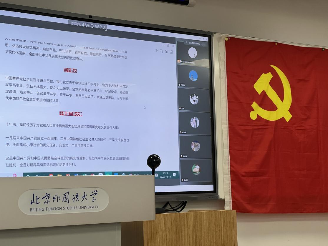活动伊始,同学们共同观看了中国共产党国际形象网宣片和二十大报告金句视频。随后,法律硕士研究生党支部胡爱旌同学作为领学人带领同学们一起学习了习近平总书记在中国共产党第二十次全国代表大会上向大会所作的报告,对报告的十五个部分分别进行了分析与学习,并着重强调习近平总书记在报告结语部分对青年人的寄语,鼓励青年学生认真领会报告精神,并将所学转化为行动,将习近平总书记对青年人的嘱托与要求落到实处。
