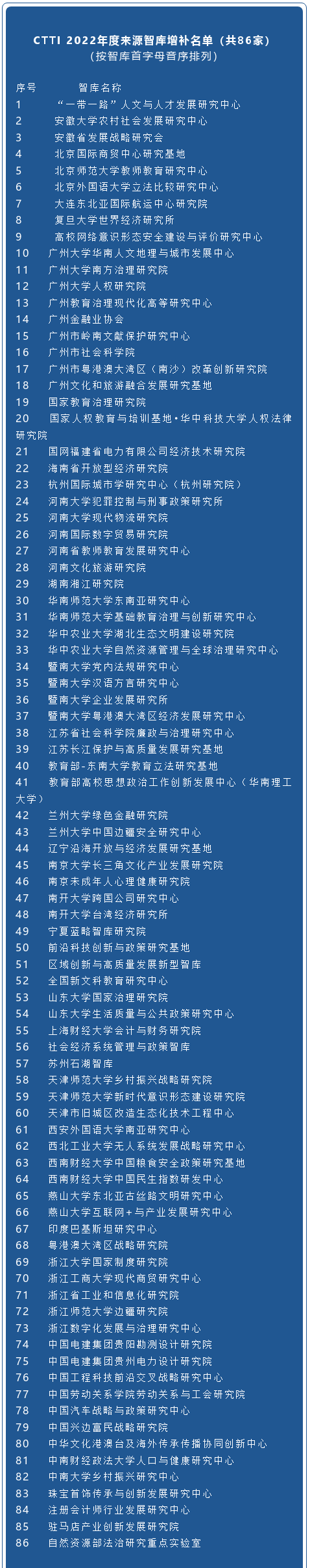 2022年10月,南京大学中国智库研究与评价中心第4次启动CTTI来源智库增补工作,经专家严格审议和评定,最终遴选出86家予以增补,永利官网立法比较研究中心名列其中。