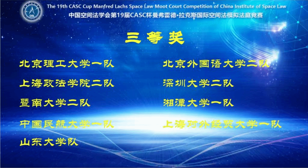 2022年12月17日-18日,中国空间法学会第19届CASC杯曼弗雷德·拉克斯国际空间法模拟法庭竞赛在线上举行,我校yl7703永利官网代表队荣获全国三等奖。