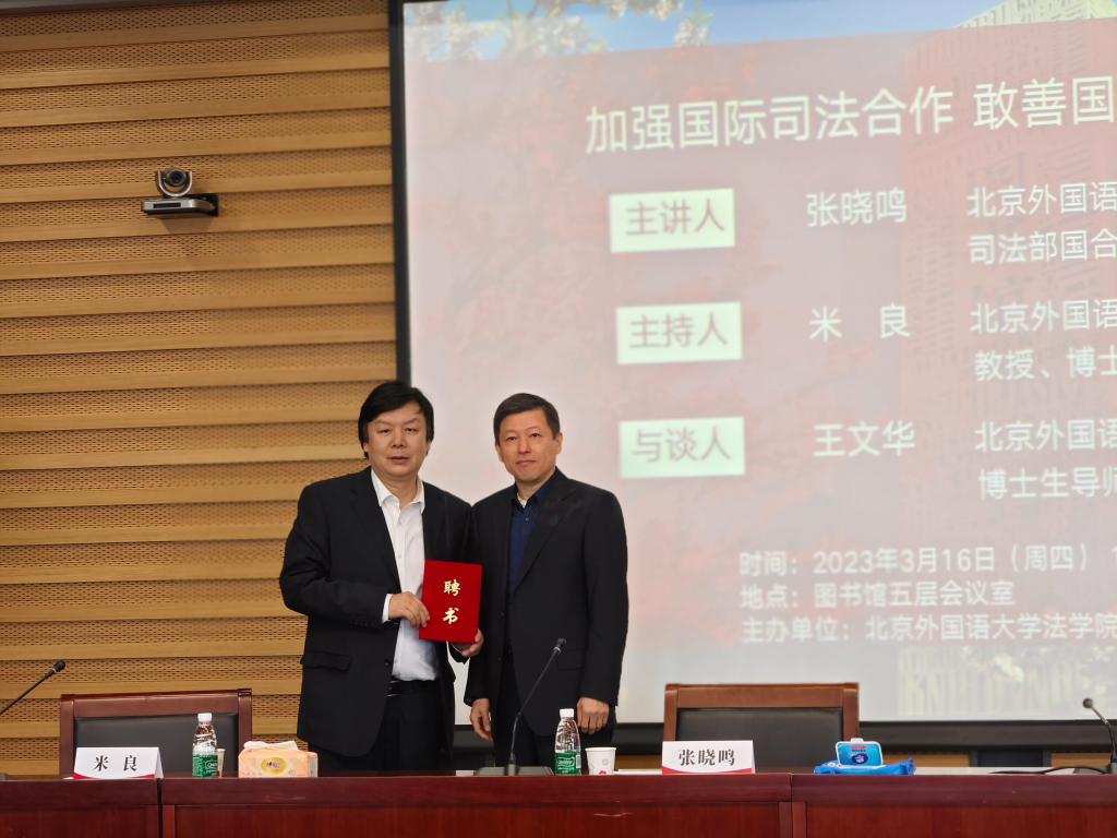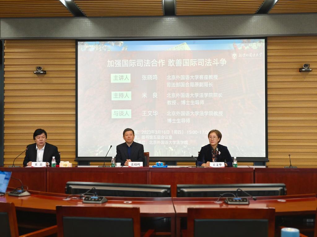 3月16日下午,“法学名师进北外——加强国际司法合作,敢善国家司法斗争”讲座在yl7703永利官网图书馆五层会议室进行。讲座邀请到yl7703永利官网客座教授、司法部国际合作局原副局长、司法部公职律师、中国国际法学会常务理事张晓鸣教授担任主讲人,院长米良教授主持讲座,yl7703永利官网王文华教授担任与谈人。