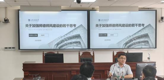 祝和军书记首先分享了习近平总书记历年来关于加强师德师风建设的重要论述,强调了高校教师师德师风建设要注意的“红七条”,从学术不端、意识形态、生活作风等方面列举了近年来违反师德师风的典型案例。祝和军书记表示加强师德师风建设具有重要意义,教育要回归立德树人的初心,教育应为强国建设承担应有责任,我国悠久的文化教育传统决定了社会期待教师言行一致、知行合一,应从加强理想信念教育、建立惩戒机制、改革教育价值导向、改造世俗环境和社会土壤四个方面入手,为加强师德师风建设提出了具有可行性的举措。
