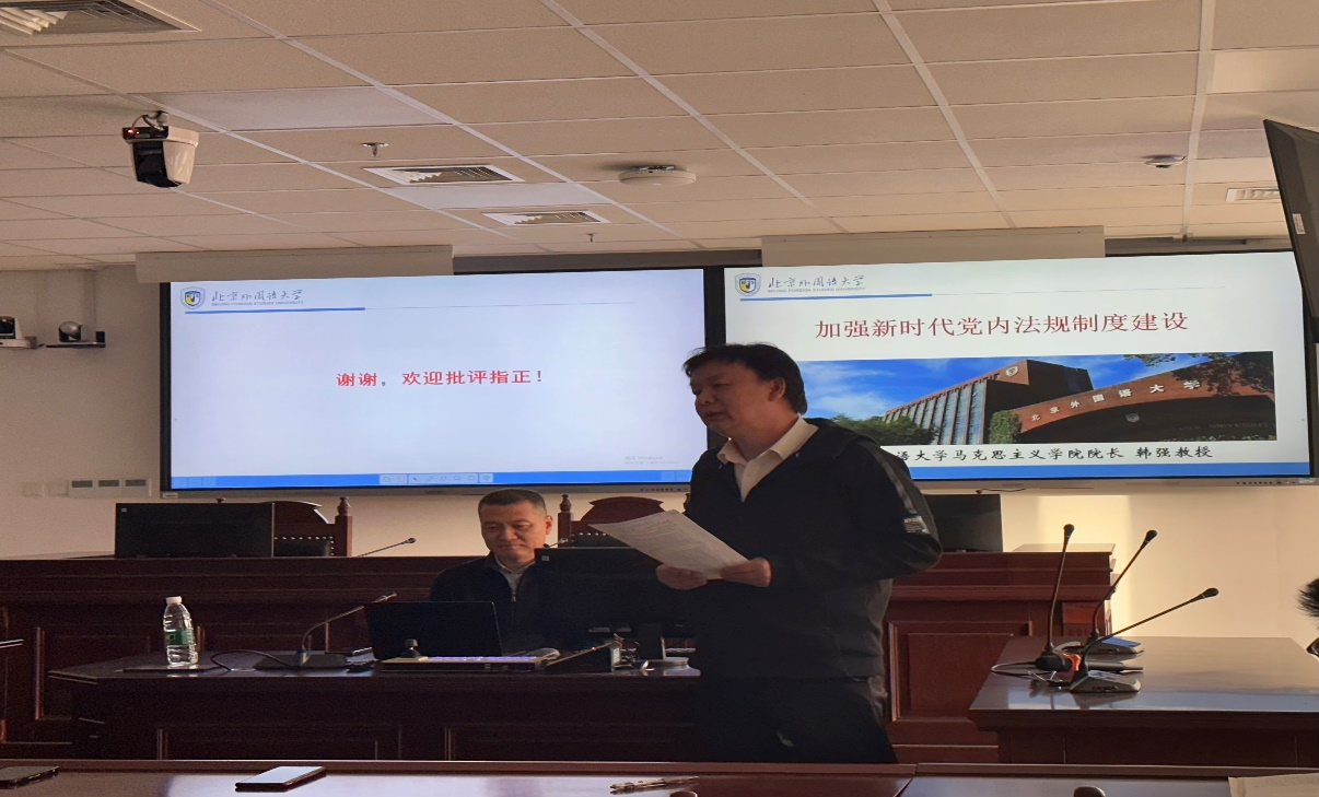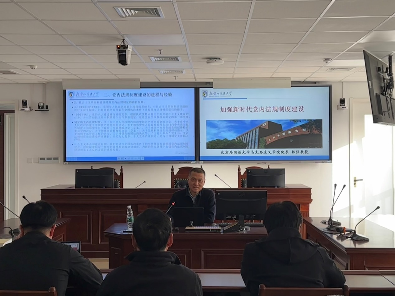 2023年12月6日下午14时,yl7703永利官网党总支邀请我校马克思主义学院院长韩强教授以“加强新时代党内法规制度建设”为主题来永利官网开展专题讲座。yl7703永利官网全体教职工参加会议,教工党支部书记董念清主持会议。
