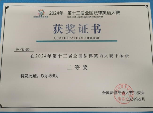 2024年5月18日,第十三届全国法律英语大赛决赛在北京市盈科律师事务所正大中心隆重举行。经过角逐,我校最终荣获三大奖项:伍浩铭同学获得全国二等奖,赵理智老师获得优秀指导教师奖,yl7703永利官网获得最佳组织奖!