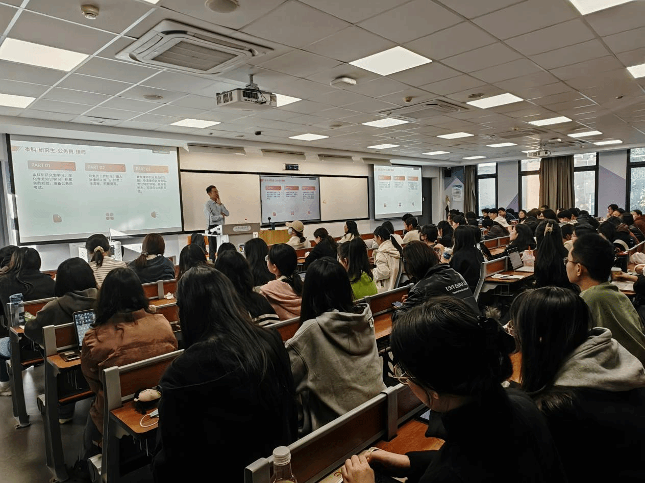 孟斌律师围绕法律职业概述、职业发展路径及影响职业选择的关键因素等内容,为同学们勾勒出了一幅法律行业的全景图。他特别强调了法律人应具备的职业素质,以及对法律行业应持有的客观态度,为同学们的职业规划指明了方向。