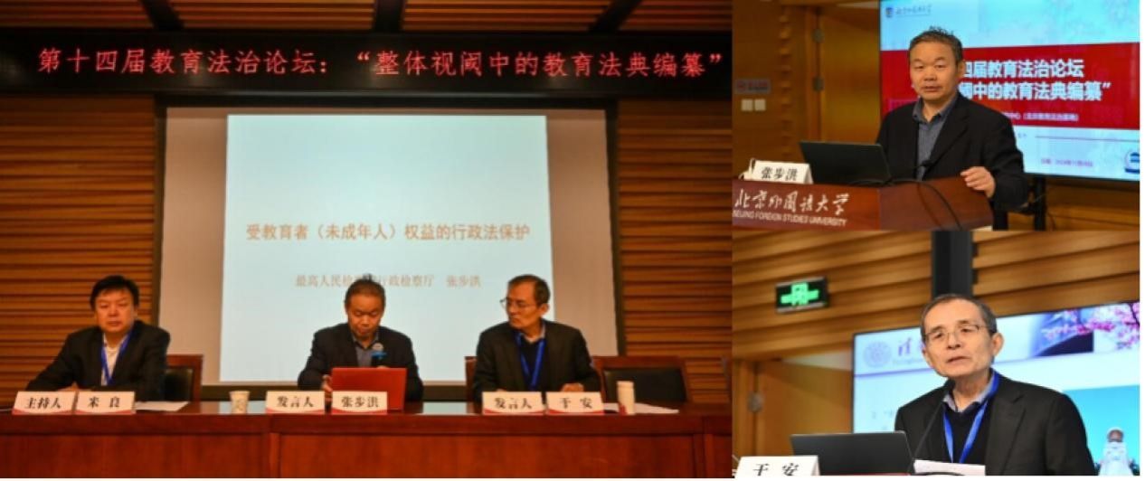 论坛包括主旨发言、主旨研讨以及圆桌论坛环节。主旨发言环节,最高人民检察院行政检察厅一级高级检察官张步洪以《受教育者权益的行政法保护》为题,从未成年人兼具主体属性和对象属性的角度出发,强调保护与教育需要相互支撑,以外在保护提升自我保护能力。清华大学公共管理学院于安教授聚焦教育、科技和人才一体化关系及其法律问题,提出了法典编纂的新视角和新方法,论证其中的法律议题和法律适用问题。米良教授主持该环节。