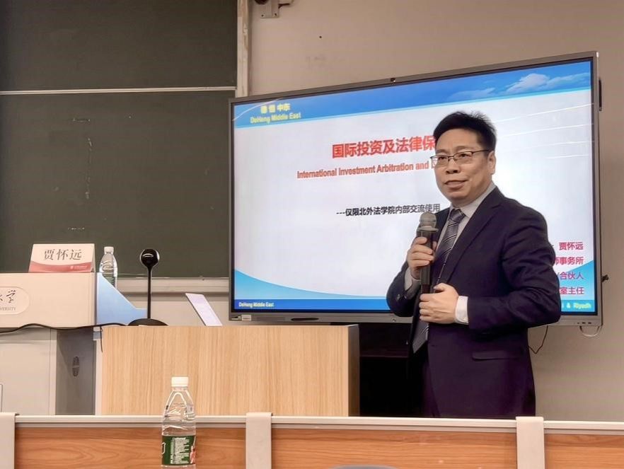 11月29日下午,“北外涉外法治大讲堂”系列讲座在逸夫楼第二阶梯教室顺利举办。本次讲座由德恒律师事务所高级合伙人、德恒迪拜分所与利亚德分所主任贾怀远律师主讲,题目为“国际投资与法律保护”。讲座由党总支副书记郭向华主持。