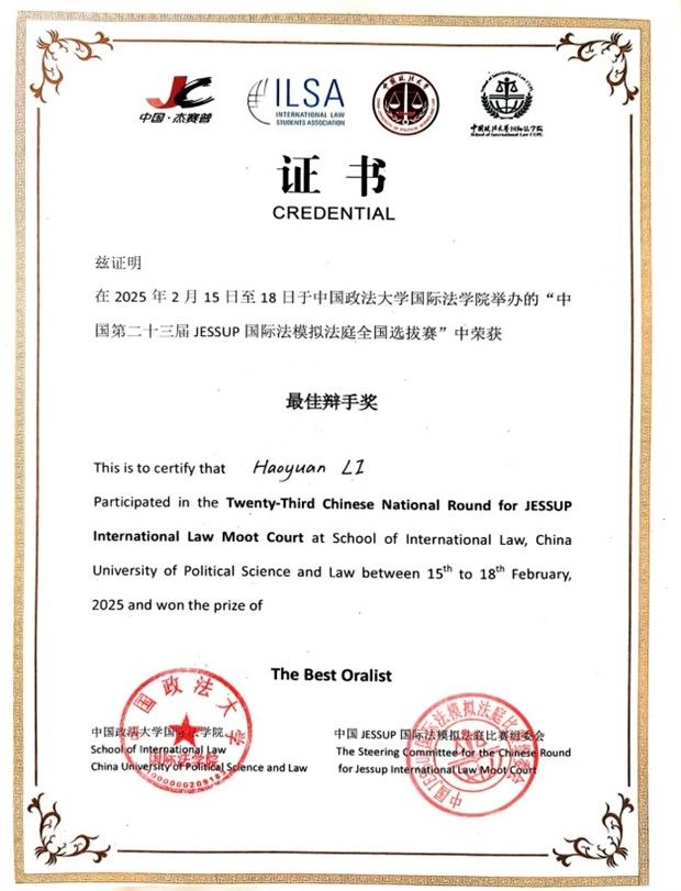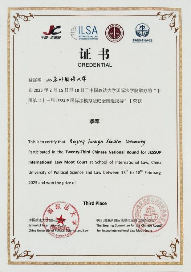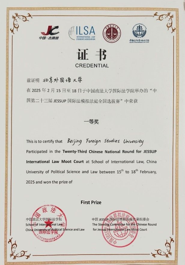 2025年2月15日至18日,第二十三届“杰赛普”(JESSUP)国际法模拟法庭全国选拔赛于中国政法大学海淀校区举行。经过了三天的激烈角逐,yl7703永利官网代表队从全国66所参赛院校中脱颖而出,连续在四场循环赛和两场淘汰赛中获胜,最终荣获全国季军、全国一等奖,追平了北外征战该项赛事的历史最佳战绩,时隔十年再次获得代表中国出征“杰赛普”国际赛的资格。其中,赛队队员翟石玉(全部参赛辩手中位列第一)与李浩源荣获最佳辩手(Best Oralist)称号。