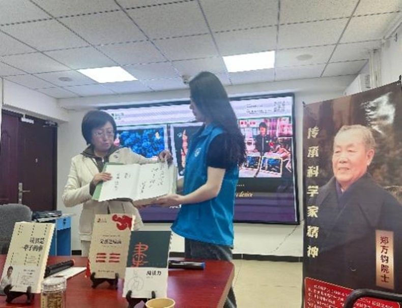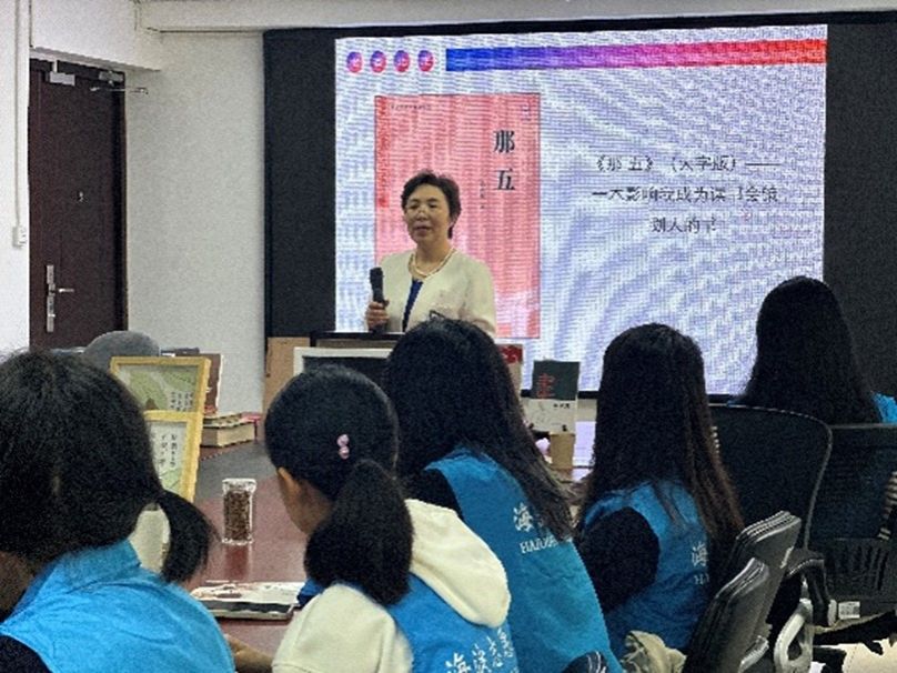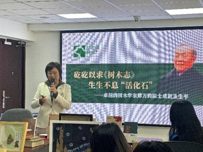 随后,“郑老师树衣”融创文化创始人、北京市海淀区中学历史高级教师郑梅老师带来演讲《生态美育和家风传承:我和爷爷林学家郑万钧院士的故事》。她以细腻笔触讲述在爷爷影响下对自然与艺术的独特感悟,巧妙融合生态美育理念与优良家风精神。演讲中,她引用梵高的话语鼓励大家打破传统阅读局限,从自然与艺术中汲取灵感。她还介绍了“树衣+”系列作品,分享如何将背景纸、树皮、书法元素结合,将书中经典可视化呈现,为志愿者们打开了艺术与阅读交融的新视野。